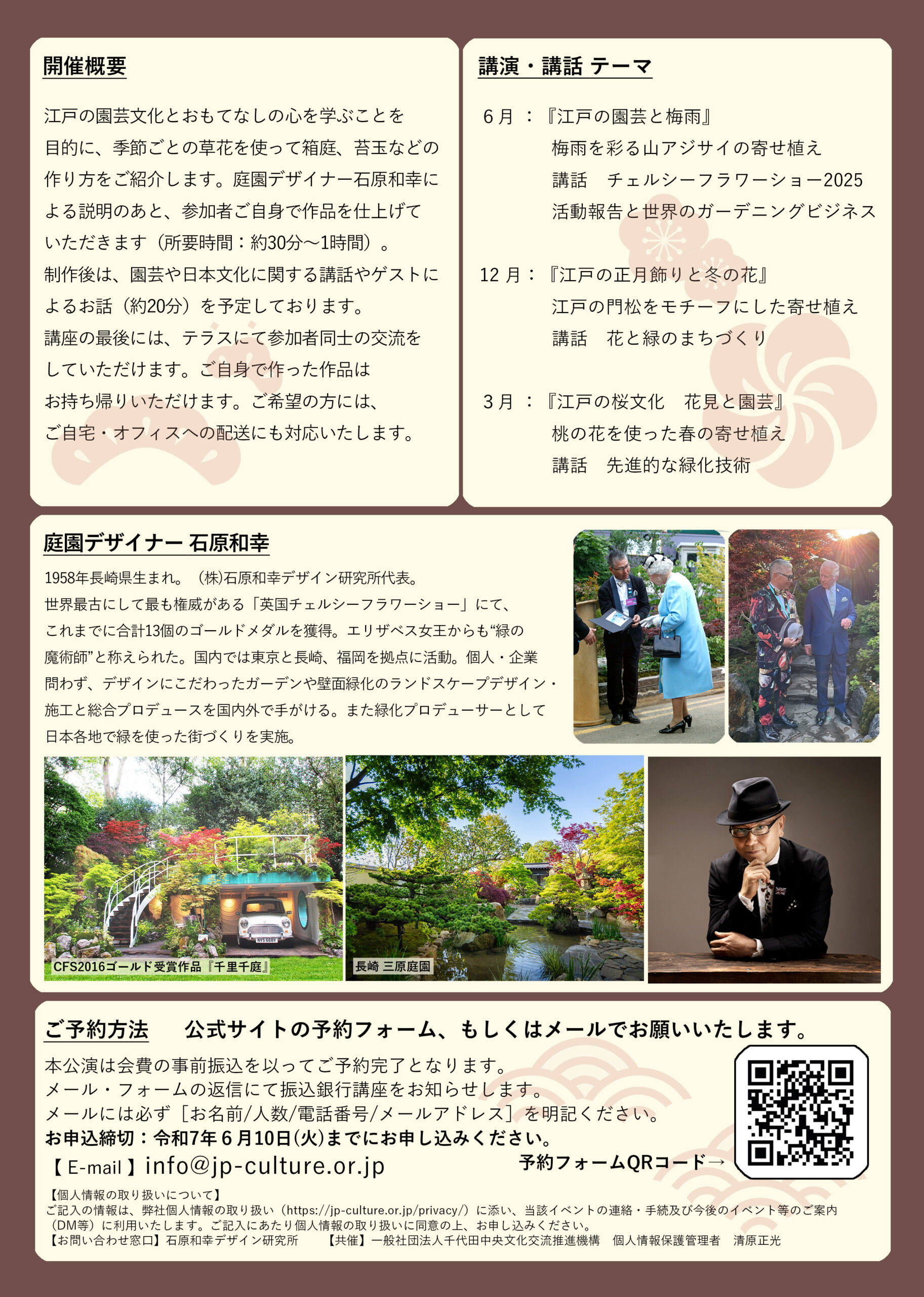 神田明神という歴史と文化が交わる特別な場所で、江戸の園芸文化を学ぶことは、日本人の美意識やおもてなしの心に触れる貴重な機会だと考えています。江戸時代には世界一庭師が多いと言われ、日本の園芸文化は世界に誇れる伝統です。この文化を学び、感性を磨くことで国際ビジネスや異文化交流の場でも活きる視点を育ててほしいと願っています。