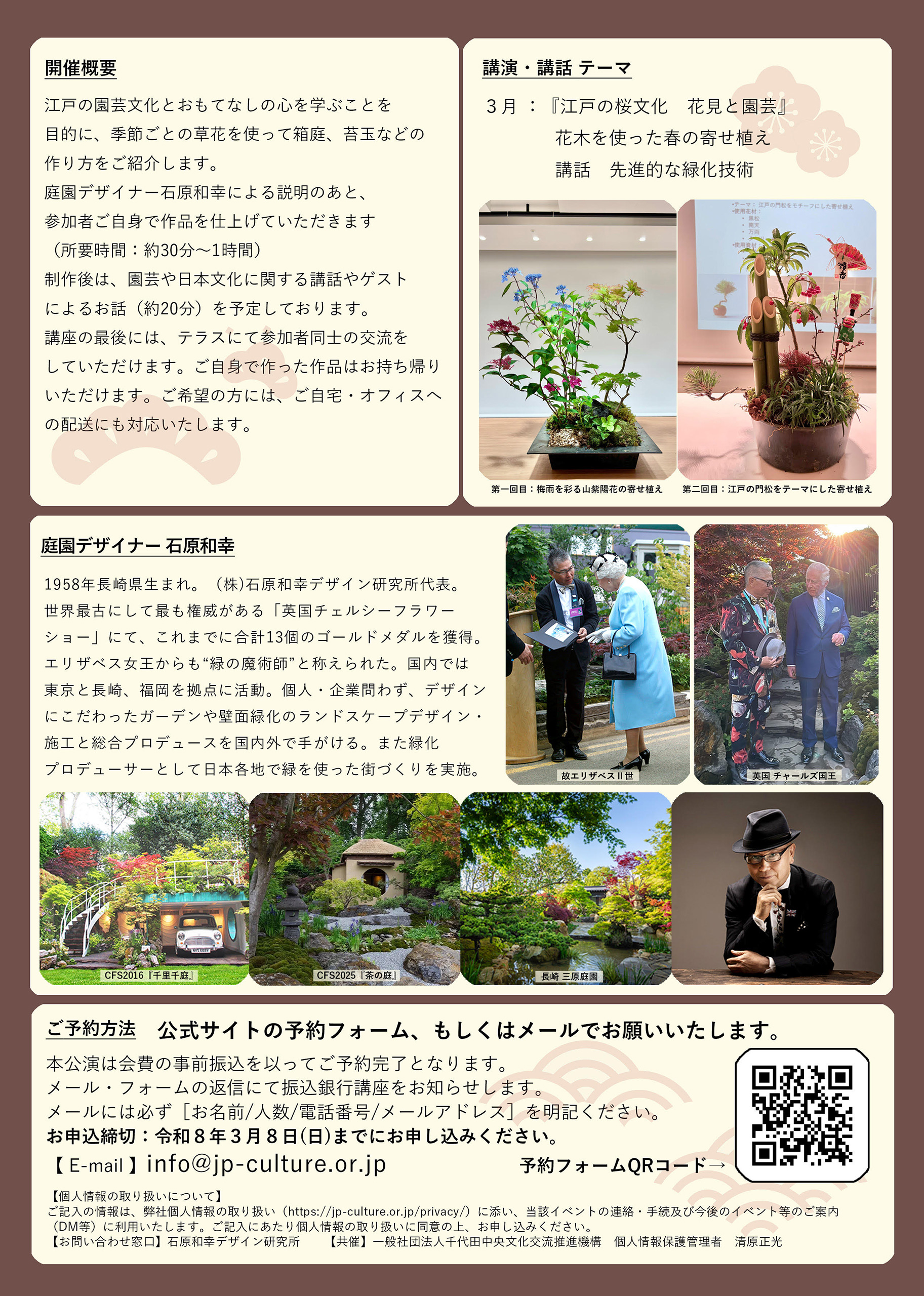 神田明神という歴史と文化が交わる特別な場所で、江戸の園芸文化を学ぶことは、日本人の美意識やおもてなしの心に触れる貴重な機会だと考えています。江戸時代には世界一庭師が多いと言われ、日本の園芸文化は世界に誇れる伝統です。この文化を学び、感性を磨くことで国際ビジネスや異文化交流の場でも活きる視点を育ててほしいと願っています。