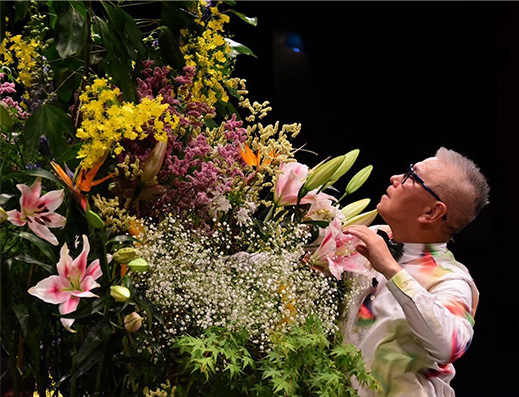 石原和幸の迫力あるパフォーマンスで、お正月のお花を使った縁起の良い門松が目の前で仕上がります。