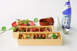 - 2段の折箱に旬の食材を詰め合わせた明神御膳。